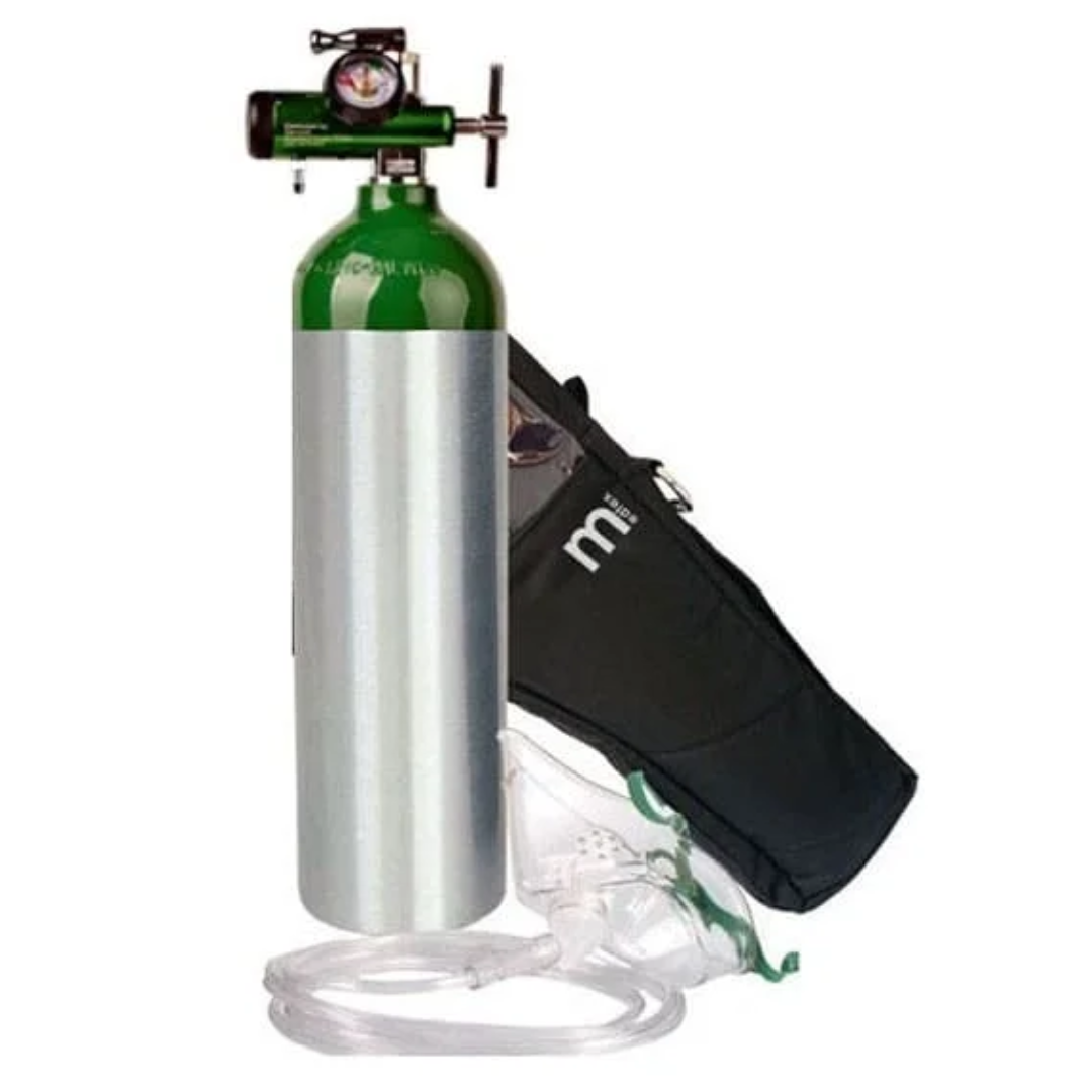Kit compuesto por: Cilindro de oxígeno (MD15) de 416 l, maleta para el transporte del cilindro de 416 l y regulador de oxígeno de 0-15 LPM.