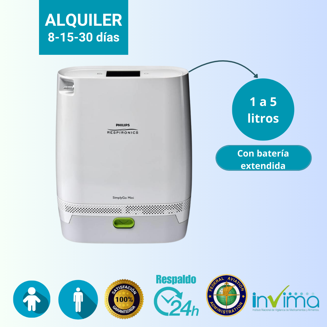 SimplyGo Mini es un concentrador de oxígeno portátil, fiable, eficaz y ligero, diseñado para ser un equipo robusto, resistente y responde a sus necesidades en todo momento, te ayudará a mantener el nivel de  actividad y te proporcionará la flexibilidad que deseas para moverte. Cuenta con batería extendida que proporciona una duración de hasta 9 h* (ajuste de pulso de 2 a 20 rpm) con fácil conectividad con cables de alimentación de CA y CC estándar para brindarte mayor comodidad y flexibilidad.