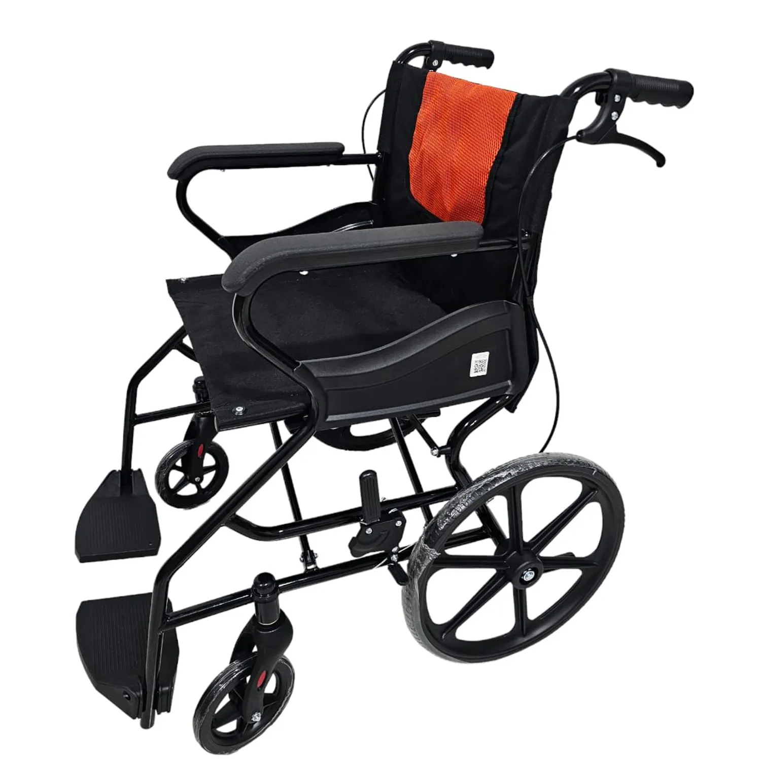 Silla de ruedas de transporte en acero, plegable con apoyabrazos fijos, reposapiés fijos y frenos de cuidador, ruedas traseras y delanteras en PU con corazas macizas y tapicería en lona acolchada, ideal para personas que requieran una silla de ruedas en interiores con cuidador