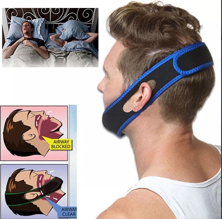 Sosteniene la mandíbula inferior con la correa para la barbilla , la mandíbula se mantiene cerrada, lo que ayuda a mantener las vías respiratorias sin obstrucciones y permite que el aire pase libremente eliminando los ronquidos.